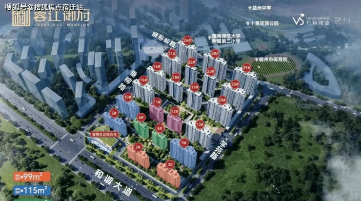 项目地处和谐大道北侧、垂柳路东侧,紧挨着赣南师大附属蓉江第二小学和赣州市保育院蓉江院区,距离赣州中学蓉江校区也很近,配套跟新旅中书文旅城是一样的。项目占地面积 74994.7㎡,总建筑面积为 182472.89㎡,容积率 1.8,建筑密度 22.2%,绿地率 30%,总户数 1019 户,机动车位 1385 个,自带社区商业、聘用万科物业。