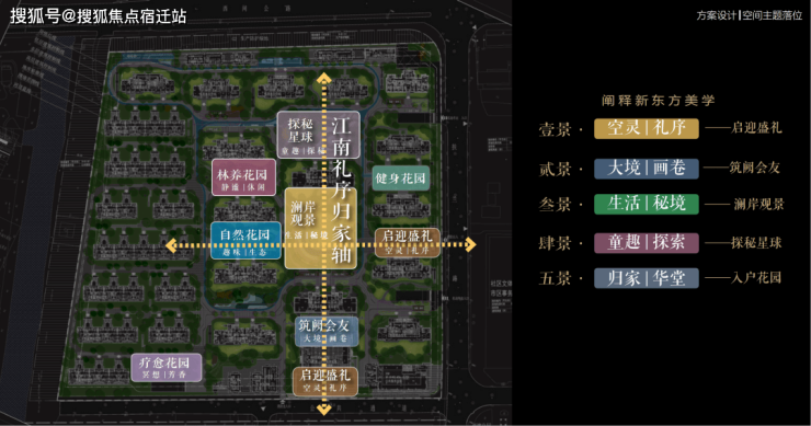以江南人文精神为源点,打造两轴一环五进空间,江南礼序归家轴串联启迎盛礼、筑阙会友、归家华堂等5重礼制,尊崇归家;健康运动轴以24小时跑道为社区活力生活环,串联儿童乐园、长者康养、疗愈花园等10大生活场景,营造全龄全时的江南诗意生活