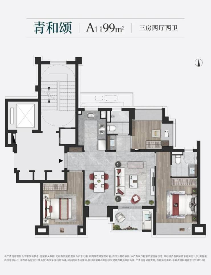 约99㎡3房2卫户型是上海市场中最主流的面积段之一,但印象青城的户型设计却超脱以往。
