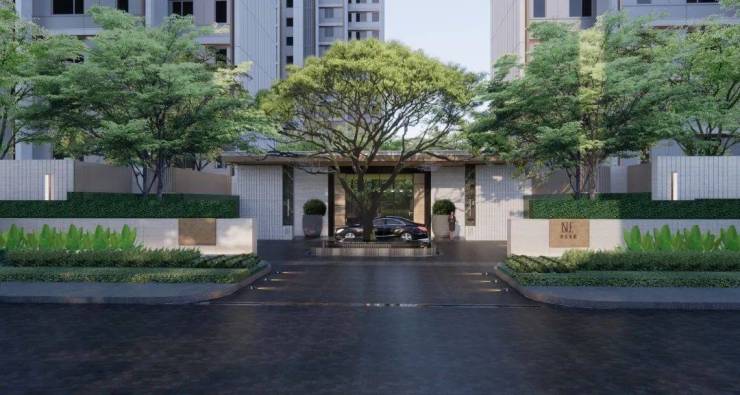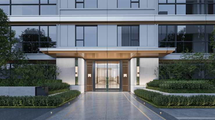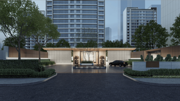 酒店式入口处的「落客庭院」,让归家的业主第一眼就能体验到松弛舒适的度假感,张力十足的造型大树,为整个入口处增添了一份自然和谐的氛围。