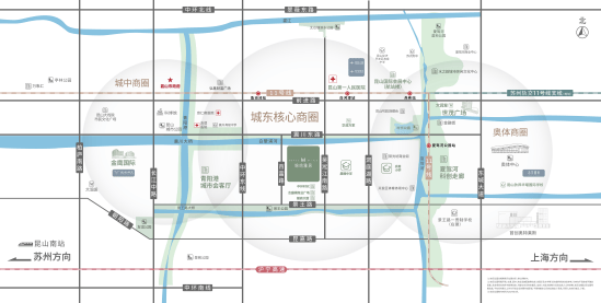 约1000m(直线距离)可达昆山市第一人民医院(东部医疗中心),集医疗、科研、教学、康复、预防保健于一体的三级甲等综合医院;约两公里内(直线距离)涵盖友谊医院、国内第一家台湾独资综合性医院——宗仁卿医院等诸多知名医院。