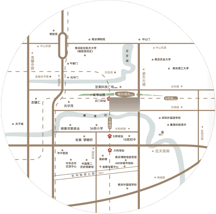 金基璟樾府仅一河之隔,临秦淮河而建,拥有不可复制的一线河景,东西双排错落分布,可以说是户户皆可观景。