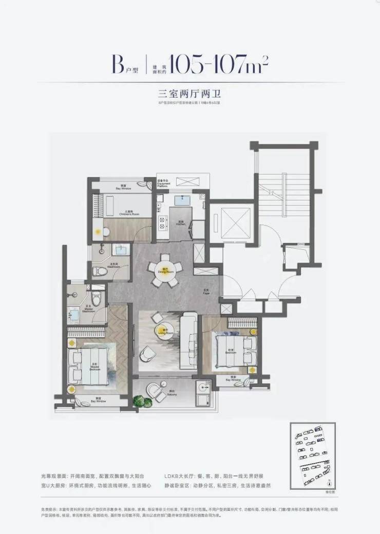 户型是在约103㎡/105㎡的基础上减少了一个南向次卧,保留了其余所有尺度和空间,面积少了10㎡左右。