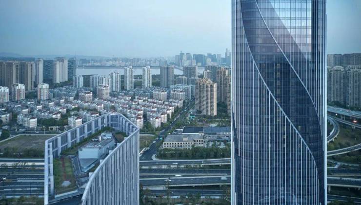 基地周边交通发达、新型业态丰富。智慧之门的建筑方案由EID Arch首席建筑师姜平主持设计,落成后的建筑群伫立于钱塘江畔,构建了一个极具辨识度的城市门户。