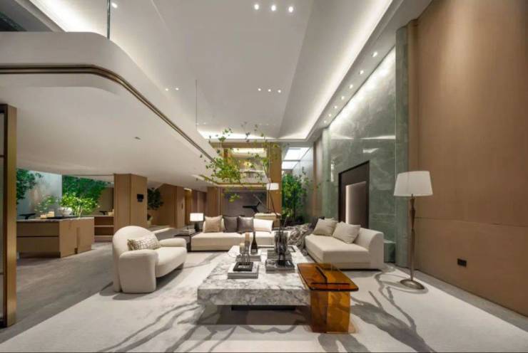 合山境【竹玉】样板房取意竹文化,臻选青玉奢石精心铺呈一层客厅和地下一层会客厅,将竹演绎为色与艺的多维符号,结合“玉石、漆器与皮革的奢华质感”,以可触、可感、可共创的人文记忆场,育化出“物境一艺境一心境”三重递进。
