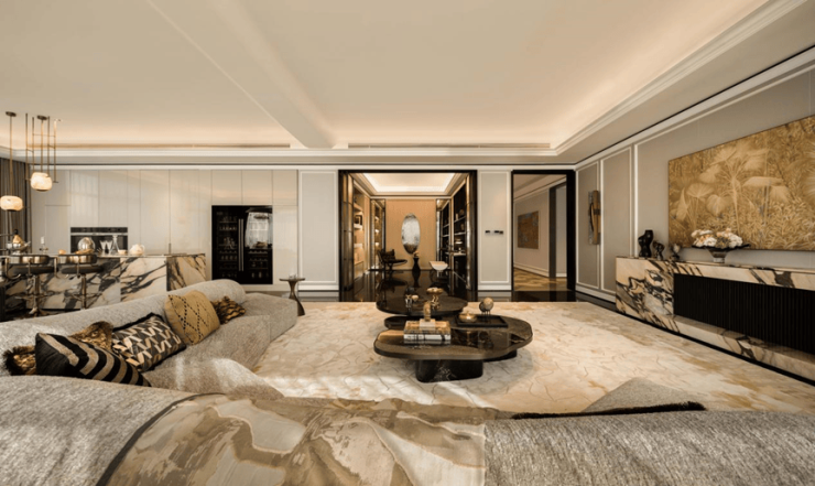 此次开放的T3『揽潮』建筑面积约410m²艺术样板,融合东意西境的设计理念,打造出独特的法式东方居住空间。超尺度中央会客厅,270°采光,日不落户型设计,让阳光无界流淌。甄选名贵奢石宝格丽粉入境,在对比张扬的纹理中糅合了一丝粉调,温润不失个性,盛纳层峯奢享生活。