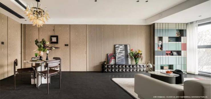 该户型三开间朝南,南北通透。相比市面常见的动静分区结构,该户型几乎没有过道浪费面积,同时打造了阔绰餐厅,可从容放下圆桌,满足大家庭的用餐需求。
