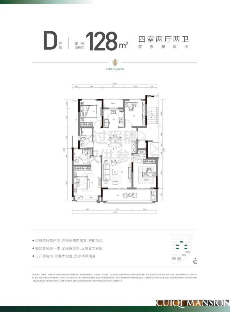 建面约128方采用了深受市场认可的经典的四叶草格局!这种户型的显著特点,就是消灭过道。客厅居于房子的中心,可以直接到达卧室、书房、厨房等各个空间。另外,4个功能间居于四角,对私密性的维护也和当下社会注重隐私的需求不谋而合,即使是孩子、长辈同住,也能有一个很好的家庭秩序。