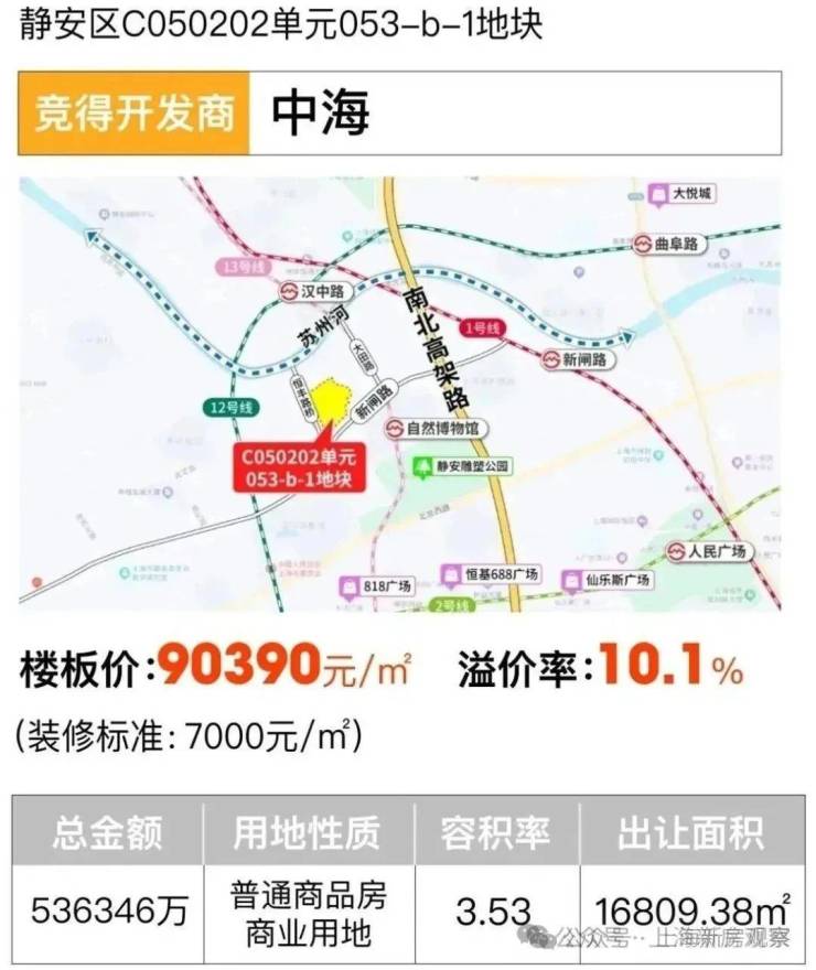 日前,新鲜出炉的今年第5次土拍结果,也应证了这个现状,优质项目竞争激烈,价格不断攀升,尤其是同属静安区的曹家渡地块(静安区曹家渡社区C050301单元9A-20地块),溢价31.2%,楼板价就达到11.41万元/㎡!