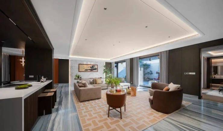 它的入口是定制游艇甲板级入户门,客厅大面积铺装意大利蓝金沙大理石,室内也全是ARMANI/Dada、意大利Poliform等一线大牌。