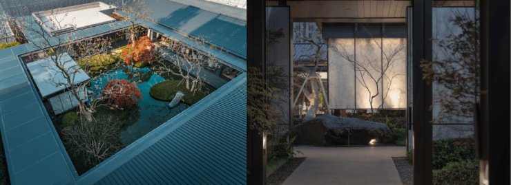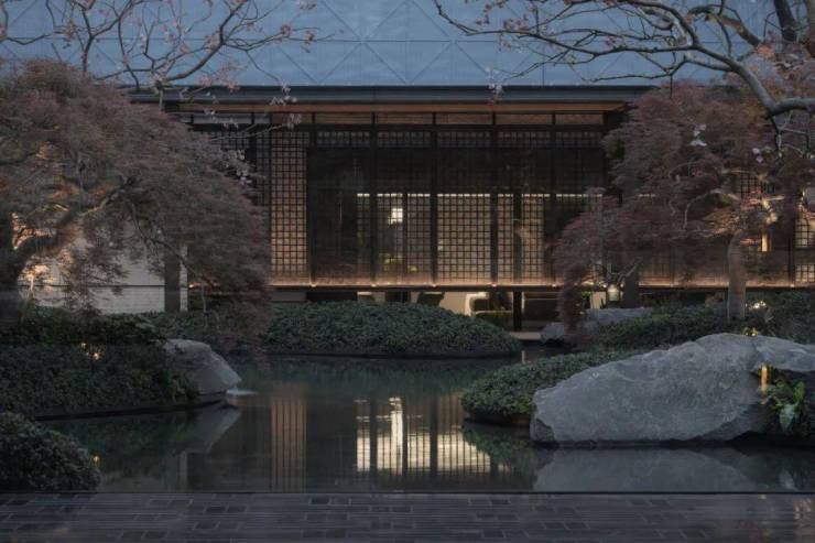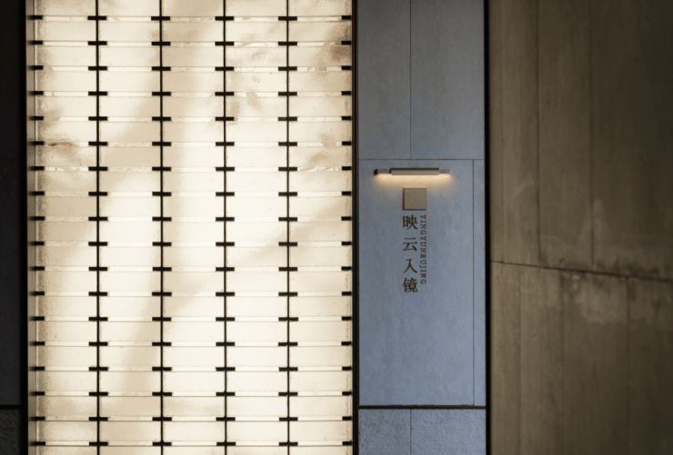提取《姑苏繁华图》中云和树影等元素, 用中轴对称的空间布局营造亲和的仪式感,透过玻璃景窗,光影斑驳,现代空灵, 营造出苏式园林典雅含蓄的景观氛围。