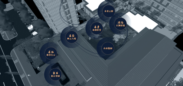 项目参考《姑苏繁华图》为背景,将清代苏州城的繁华盛况融合现代景观元素,提炼出「磐石、层林、云影、云亭、清流、翠台」六大场景,每个区域都展现着独特的设计理念和艺术氛围,并传递出居住环境的生态氛围。