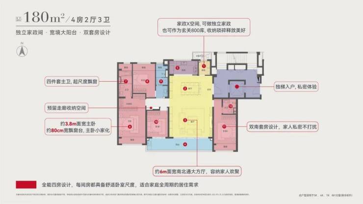 在优越的空间利用率面前,其它闪光点都成了锦上添花。但基本上市场大平层必备的要素,ta都有——标配大横厅、标配洄游结构、标配动静分区、真南北通透等等。