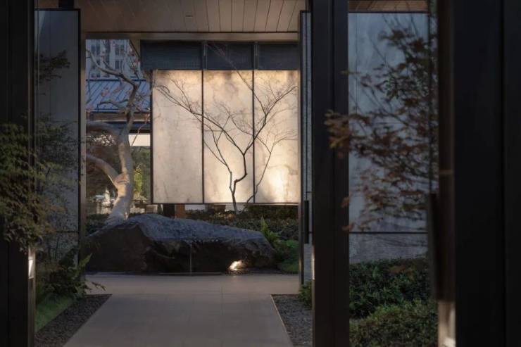 行至院落,忽闻清音袅袅,循声而入,绿意浓浓,精致窗门下感受幽雅的渗透空间。运用夹景的手法,左右两侧景墙加以屏障,使景观空间延伸至景观焦点,一树、一石、一光,叶疏影秀,小中见大。