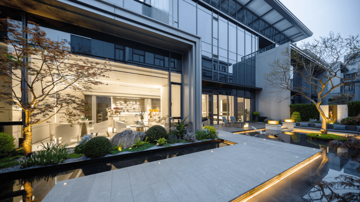 云湖印建筑立面采用大面积玻璃幕墙辅以灰系铝板装饰,呈现都市现代极简气质,满足高素质人群对人文艺术生活的追求,同时,作为之江难得的平墅产品,约1.8低容积率,营造真正的舒适居住秘境。
