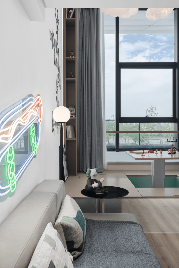 在光影所建构的空间内,将美好以不同方式留下。专为艺术青年打造的线性空间,凝练简洁。牛油果绿皮革长条沙发,哑光质地的特殊材质与透软的浅白地毯形成强烈的视觉冲击,不同材质与颜色的对视感,一如趋势青年冷酷的外表与火热的内心。和而不同,便是他们的生活态度。