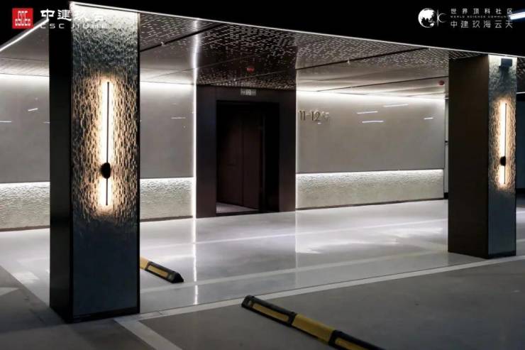 中建玖海云天是临港首个精装修地库的社区,仲公子来到地下车库的入口,首先映入眼帘的是坡道上方“世界顶科社区玖海云天”的logo文字,归家仪式感拉满。