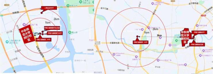 作为上海的四所985高校之一,华东师范大学拥有普陀、闵行两个校区。而在华师大校区3KM内,必有华二(含高中部或初中部,数据信息采集百度地图)。