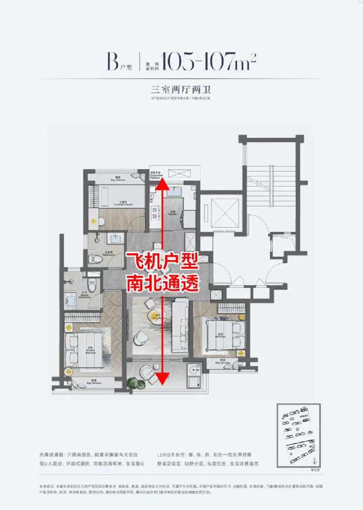 这是一个可以几乎可以打满分的王炸户型,在三开间朝南+南北通透+阔绰餐厅基础上,做到了主卧和北次卧L型大飘窗设置,拥270°采光和视野。