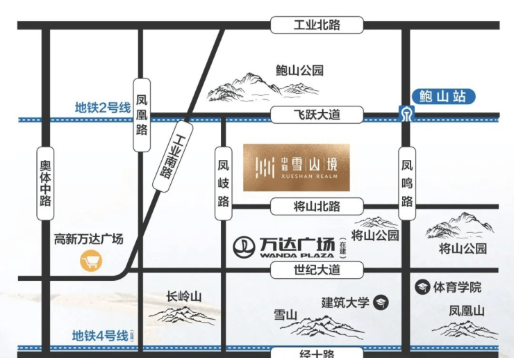 “三横三纵一轨道”路网成熟,三纵:凤鸣路、凤岐路、凤凰路,三横:经十路、飞跃大道、世纪大道;距离地铁R2号线鲍山站仅约800米;距离4大产业区(CBD、高新软件园、汉峪、奥体)约5-8公里,黄金通勤圈。