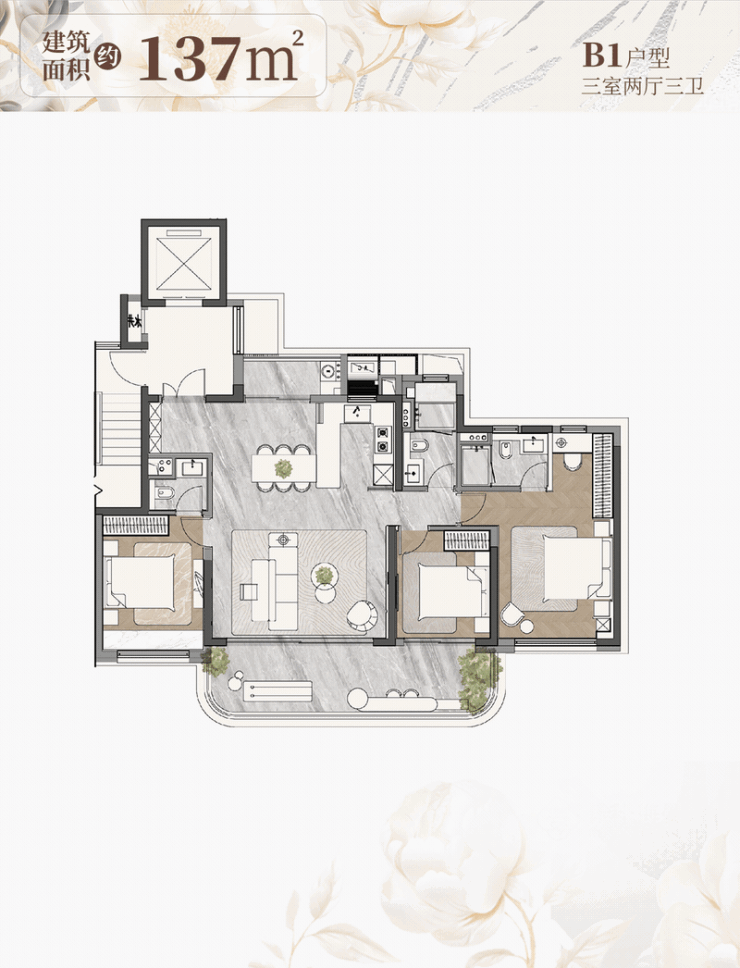 137㎡超标三房,作为海棠片区内同面积唯一的三卧室朝南、双套房、南北双阳台极致产品。
