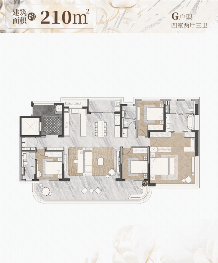210㎡四房产品,多套房、大衣帽间、大主卫设计,也契合了度假新贵“舒展”的生活方式,可谓是传世奢宅。
