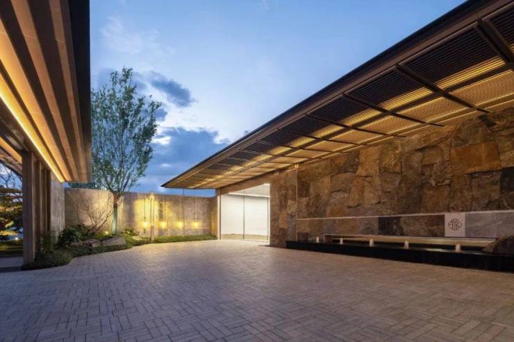踏入样板房,第一眼震撼来自院门——高2.7米、宽2.2米的双开金属门,两侧镶嵌山茶花纹格栅,庄重如士大夫府邸。