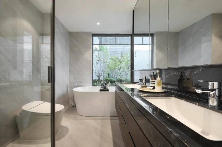 阳台开间约7.8米。同步,主卧奢享270°转角飘窗,主卫也配置了270°景观落地玻璃窗,浴缸、双台盆等五件套配满,常见于高端大平层的配置,在这里同样可见。