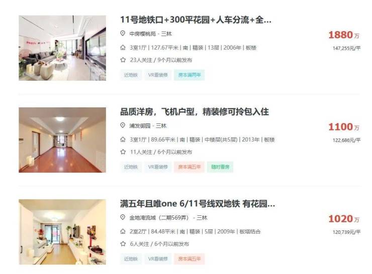 板块内部,由于三林板块规划起步晚,「永泰三里城」周边几乎都是次新电梯房,板块内二手房挂牌均价9万/㎡左右,不少户型较好的楼盘甚至能跑上10w+。
