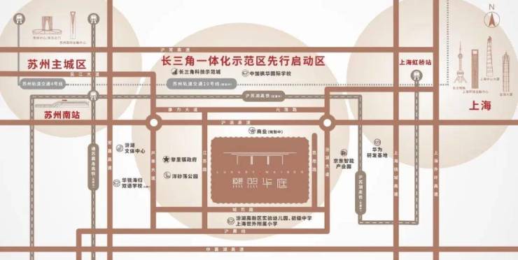 苏州南站距本案约𝟕公里。通苏嘉甬铁路、沪苏湖铁路交汇,未来汾湖前往上海仅𝟐𝟎分钟。