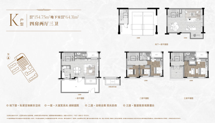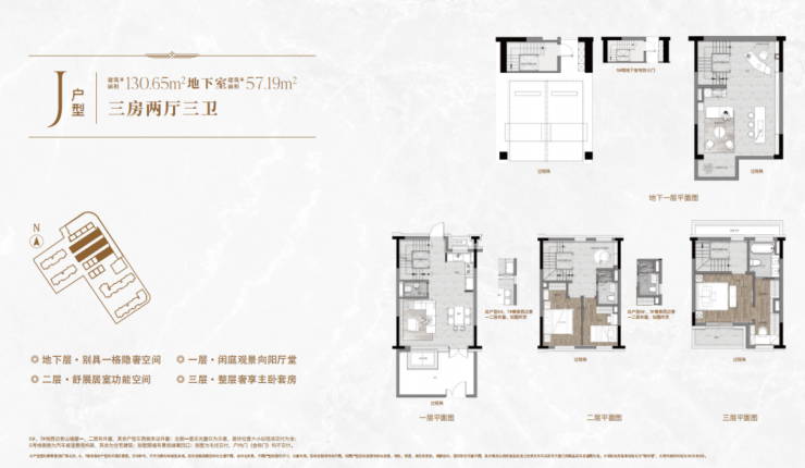 一楼和地下室主社交和志趣,二楼是子女的房间,三楼是主人休憩区。