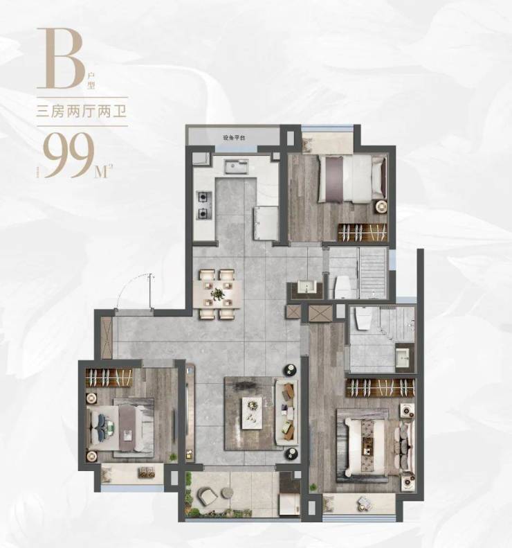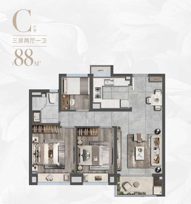 项目总建筑面积约12.5万方,总规划8栋14F和3栋16F小高层,涵盖建筑面积约88/95㎡三房、约99㎡三房和约133㎡四房“全龄全时成长型”户型。