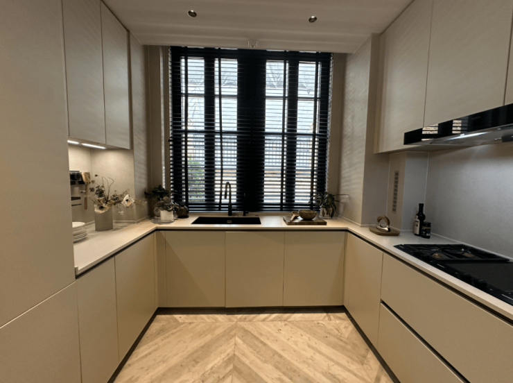 一楼为整体餐客厨空间,整体面宽超过13米,客厅南向正对别墅庭院,整体室内采光充足