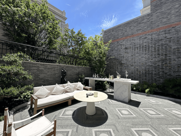 整体一层空间的东南方向,样板间设计为了茶室,配合西向落地玻璃窗,同样正对庭院。