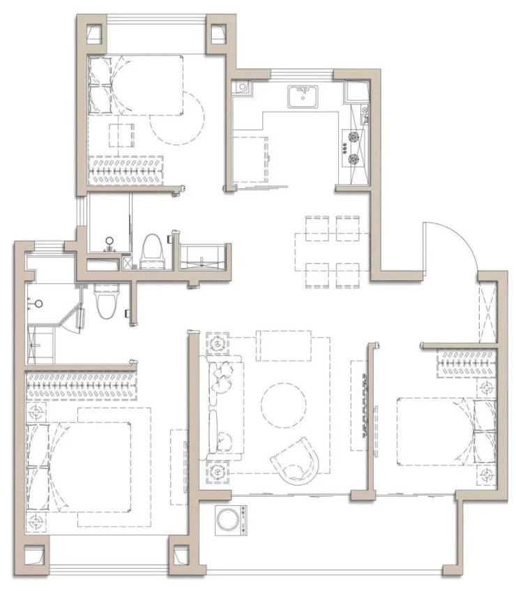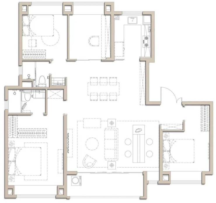 建面约100㎡是个典型的飞机户型,全明户型南北通透,独立玄关实用美观,几乎无过道浪费,延伸了空间的尺度。