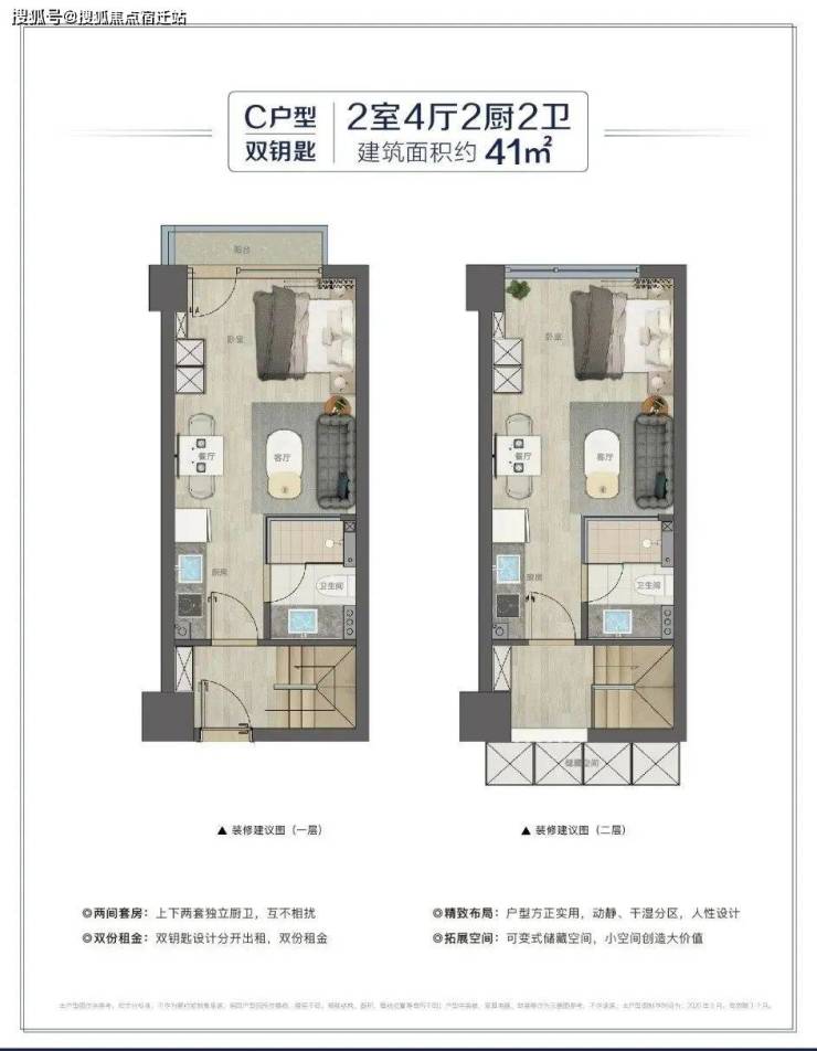 主力面积32 m²的Loft设计的是2房2厅1卫!比较适合拿来自住,部分挑高,楼下公共区域,楼上私享空间,动静分明,来了朋友都还能留宿。41m²的双钥匙,楼上楼下独立门户,出租的话,就是两份收益,投资回报率更高。