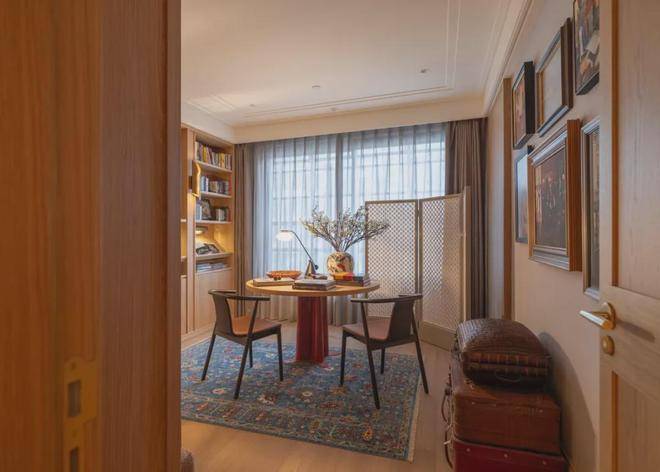 主要位置的多功能大长桌,可以做书桌,聚餐冷餐摆台,也可以做艺术品展示桌,让艺术与空间交融相生。同时,大长桌也起到了模糊走廊与客厅空间的作用,无形中放大空间的层次感,增添了空间的功能性。