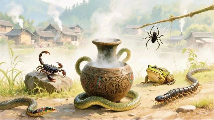 古俗认为端午"五毒"(蝎、蛇、蜈蚣、壁虎、蟾蜍)活跃,阳气过盛反伤人。
