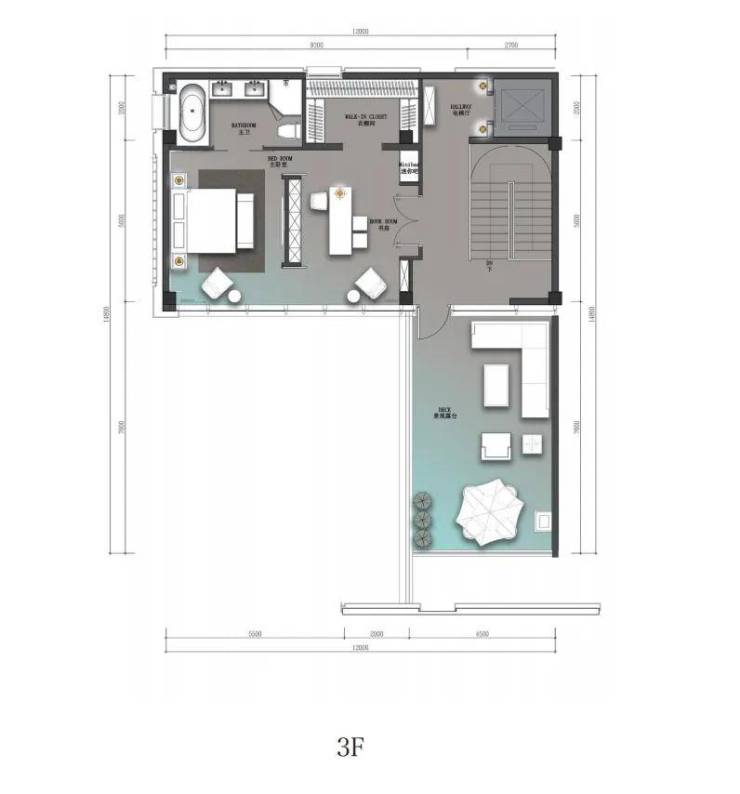 三层端厅式大空间,只打造尊贵一室,利用近乎一整层的面积来满足供主人休憩+工作结合的心灵栖息之地,南向270°大采光面+超广角视野,赏一年四季风景如画。独立步入式衣帽间及带浴缸大卫生间的点缀,更加彰显仪式感、开阔感、功能性、舒适性、私密性强。
