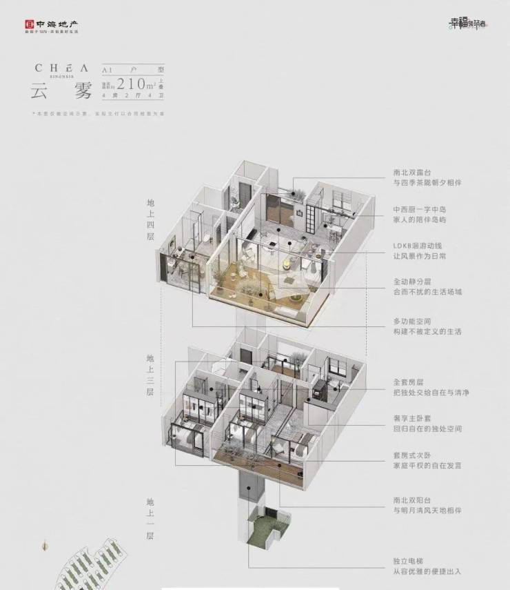 以建面约210㎡的上叠“云雾”和建面约221㎡的下叠“旗枪”为例。月陇云岚解决了很多叠院上下叠共用电梯这个痛点,在这个项目里,所有的户型都是私梯入户的。下叠入户口在南向花园,上叠在一楼也有北向私梯入户花园空间。