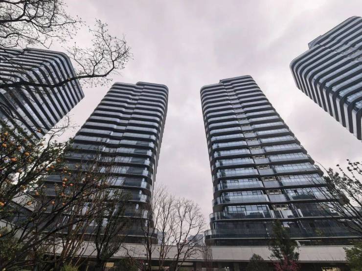整个项目由6幢高层围合而成,其中商业大平层4幢,1幢酒店,1幢写字楼。项目外立面整体以圆弧玻璃幕墙为主,搭配铝板线条作为装饰,也算是这个“宇宙”片区的统一样式了。通过外立面也能看到,大平层外围几乎做到了360度环形阳台。