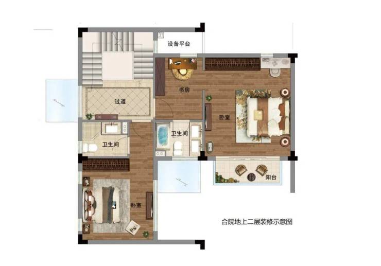 二层三层所有房间均做了南向套房设计,尤其还做了双主卧套房的概念,这正是基于深度解读了合院类客户的需求。房间不追求多,但尺度和舒适度上必须奢侈,不论是作为长辈房还是子女居住,舒适性是首要考量。