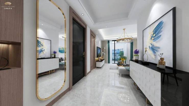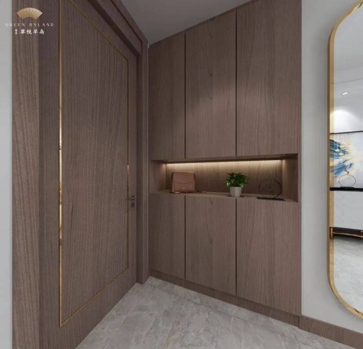 而入户玄关柜,采用了三段式玄关柜设计,上中下各设收纳分区,保持了整个空间私密性的同时,在空间使用率上又做到了合理分配。上层收纳区可用于收纳使用频率不高的家居或换季鞋服;中层物件区悬空并设置了内打灯,可摆放观赏性摆件/家庭相簿、钥匙等小物件,温馨十足;下层常用区可收纳常用鞋、拖鞋等,空间大,可满足全家鞋子收纳需求。