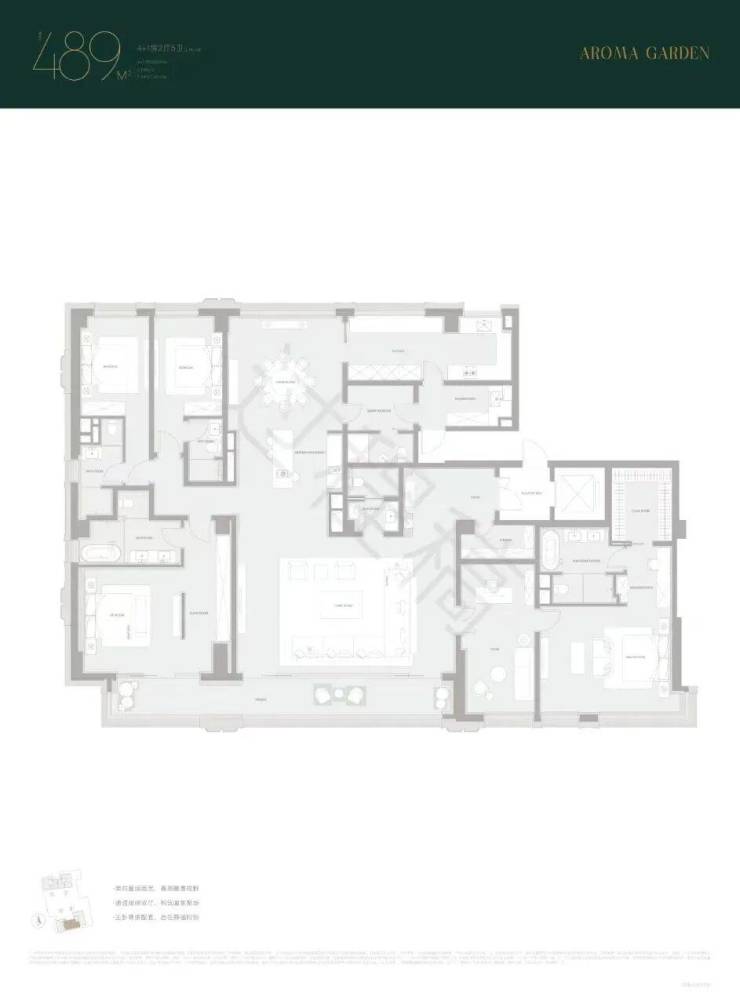 建面约489㎡,四个大套房,主卧甚至”小家化“了,还带书房,270°转角飘窗多一面观景享受。整个户型大面宽、窄进深,配上连通式大阳台,采光非常好。