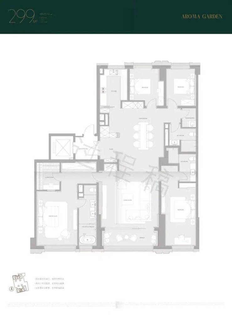建面约299㎡,南向双套房,尤其主卧是豪华套房,带独立衣帽间,卫浴间含双台盆+淋浴+浴缸+马桶四件套。