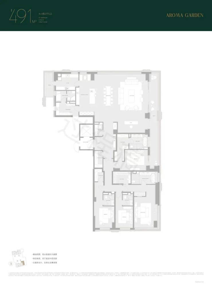 建面约491㎡,逾百平方客餐厅一体+270度转角落地窗+可以做”跑道“的超宽尺度花园阳台,拥有这个户型,妥妥人生巅峰。