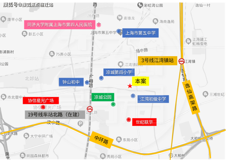 交通方面:项目距离3号线江湾镇站直线距离约900米。19号线(在建)车站北路站直线距离仅200m,将来出行十分便捷。自驾方面,周边有中环高架、南北高架、逸仙路高架等快速路。
