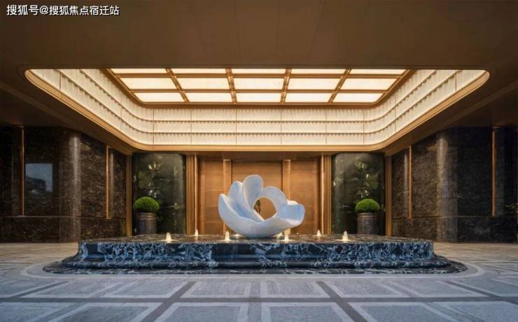 步入门庭,云石吊顶之下,借鉴中国古代建筑中的“藻井”做法,由522片皇家白玉石材拼接而成,凝聚光华,辉映时空。华光之下,中心水池承托起艺术雕塑,莹润皎洁,宛若珍宝。立面则采用铂金钻奢石,搭配墨绿荷塘月色奢石、安哥拉黑奢石花钵、以及手工锻造的巨幅铜门,流淌出一抹温润质感。