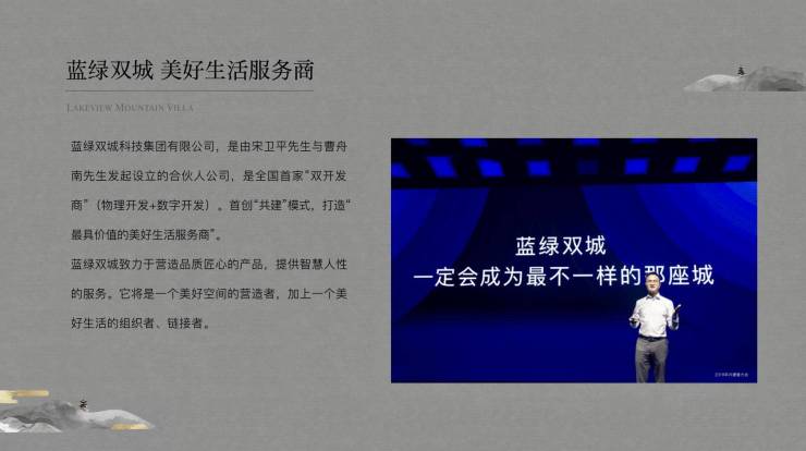 蓝绿双城是由宋卫平先生与曹舟南先生发起设立的合伙人公司,是全国首家 “双开发商”(物理开发+数字开发)。蓝绿双城公司传承宋卫平先生27年一直倡导的价值理念和品质精髓,首创“共建”模式。