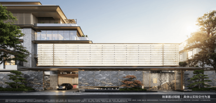 建筑取法吴越古建,三重重檐叠落映天际,宽檐浅廊承东方雅致。安哥拉黑、普拉达绿等奢石琢形,黑松红枫相映成趣,铝板、陶板与玻璃碰撞出古今对话。每一处肌理都暗藏文脉,每一寸材质都经得起时光,如吴越水墨绘就当代画境,让世家威仪与生活温度兼具。